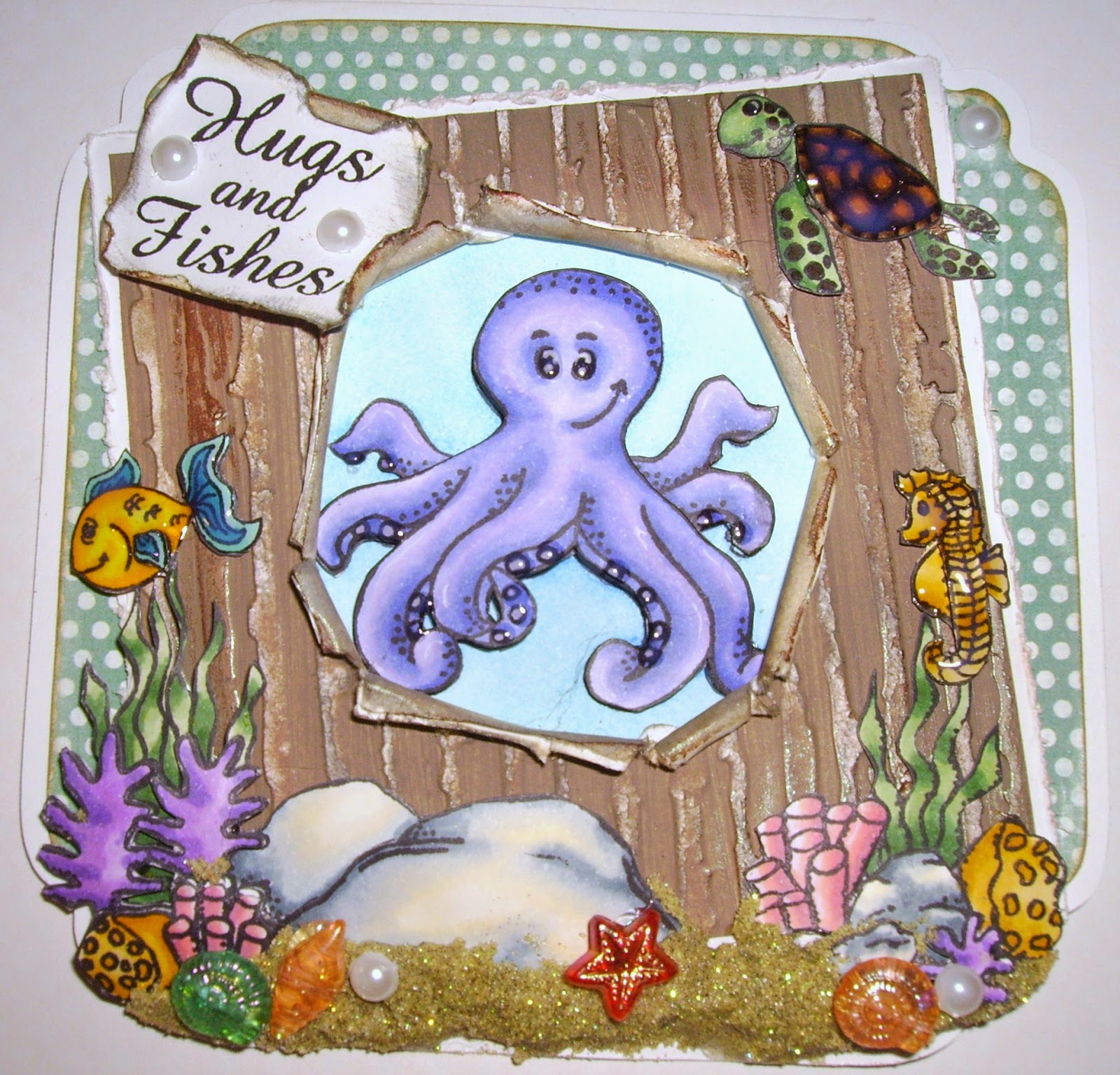 I absolutely love this card! The octopus just makes me smile. The wood look card you've used is brilliant and looks so good. Then that wonderful sand and other stamped images. Wow!