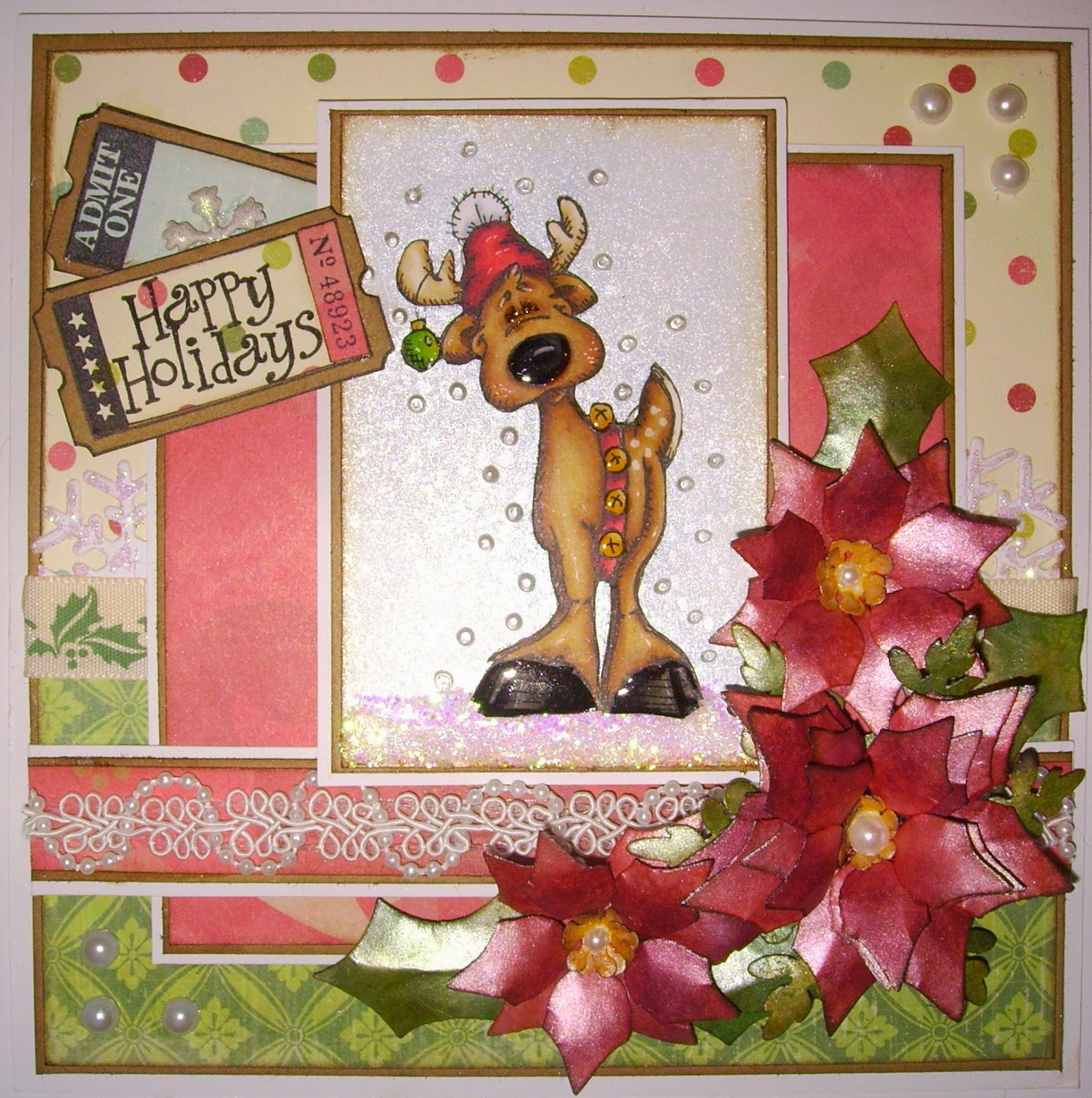 Hello, today I have made a card using a stamp from Whipper Snapper Designs called 'Rodney Reindeer'. I stamped the image with 'Tuxedo Black' Memento Ink and coloured it with Copic markers and a white gel pen. The background behind the reindeer was made using 'Broken China' Distress Ink and some Pearl Mists. I have used some chunky glitter for the snow and Perfect Pearls for the falling snow. The tickets are stamps from Inkadinkado and the sentiment is a stamp from Hero Arts. The background paper is from K and Company and I have also added some Kraft and white card stock for the layering. I have used some snowflake die cuts on the background and for the foliage behind the large Poinsettia and the Holly leaves and Poinsettia dies are all from Crafts- Too. I have finished the card with some ribbon, lace, pearls and Glossy Accents. The card measures 6 1/2 x 6 1/2 inches.