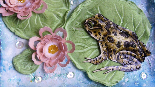 The Frog was outlined with a 01 Black Uni Pin Pen and coloured with Warm Grey Copic's and a Tonic Nuvo blender pen for a base layer. I then added details and colour with Faber Castell Polychromos pencils and white Acrylic paint for the highlights. I then added Glossy Accents to the Frog's eye and to the 'bumps' on the Frog's body. When that was dry I added some Gloss Medium all over the Frog to make him seem like he has just jumped from the water.