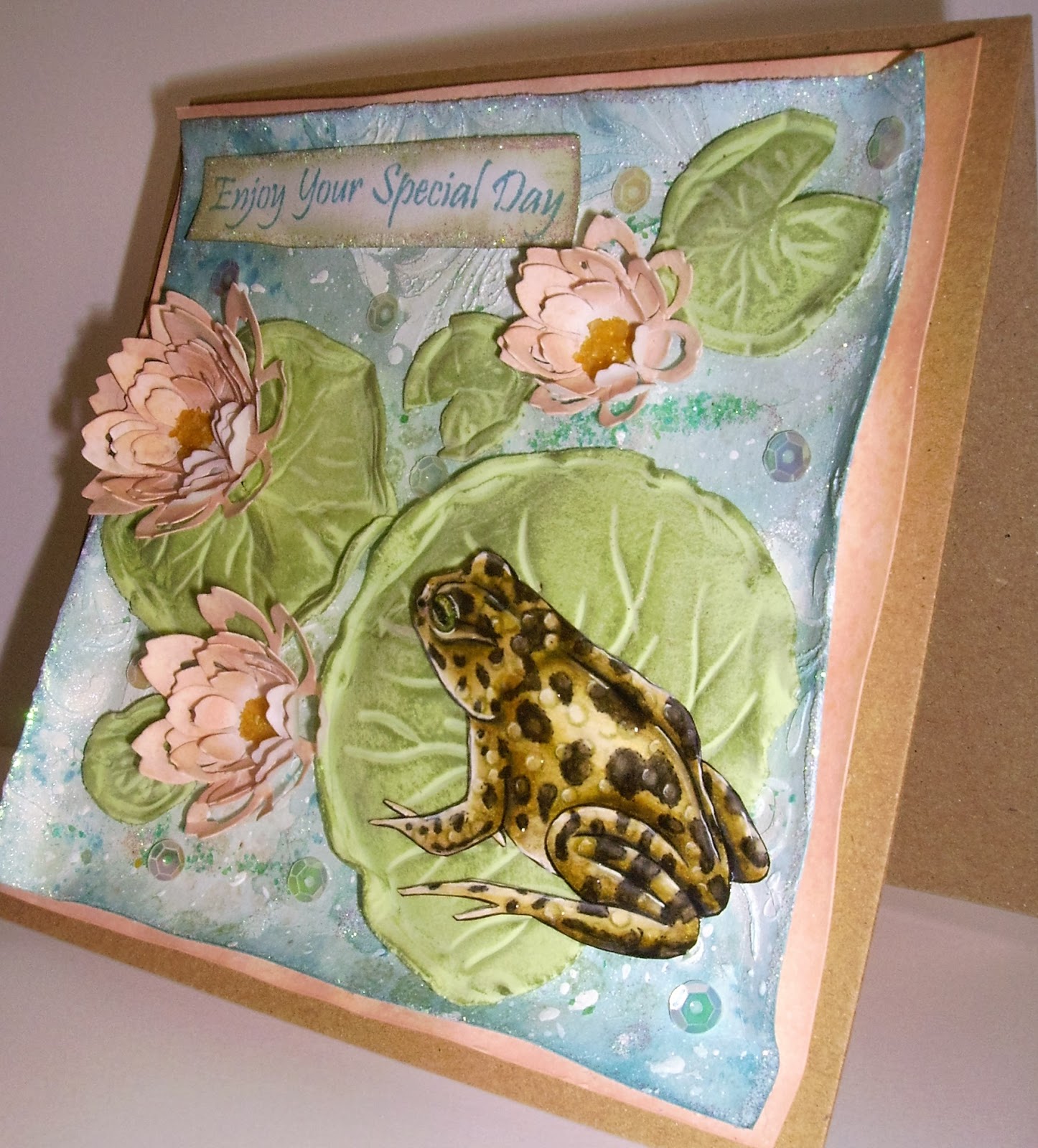 The Water Lilies were cut from white card with a die from Pinflair and coloured with 'Tattered Rose' Distress Ink. I also used a Texture stamp from Hobby Art to add a slight texture to the petals with the same Ink. I curved the petals and stuck the different sizes together and added some crushed yellow Mica Flakes for the centres.